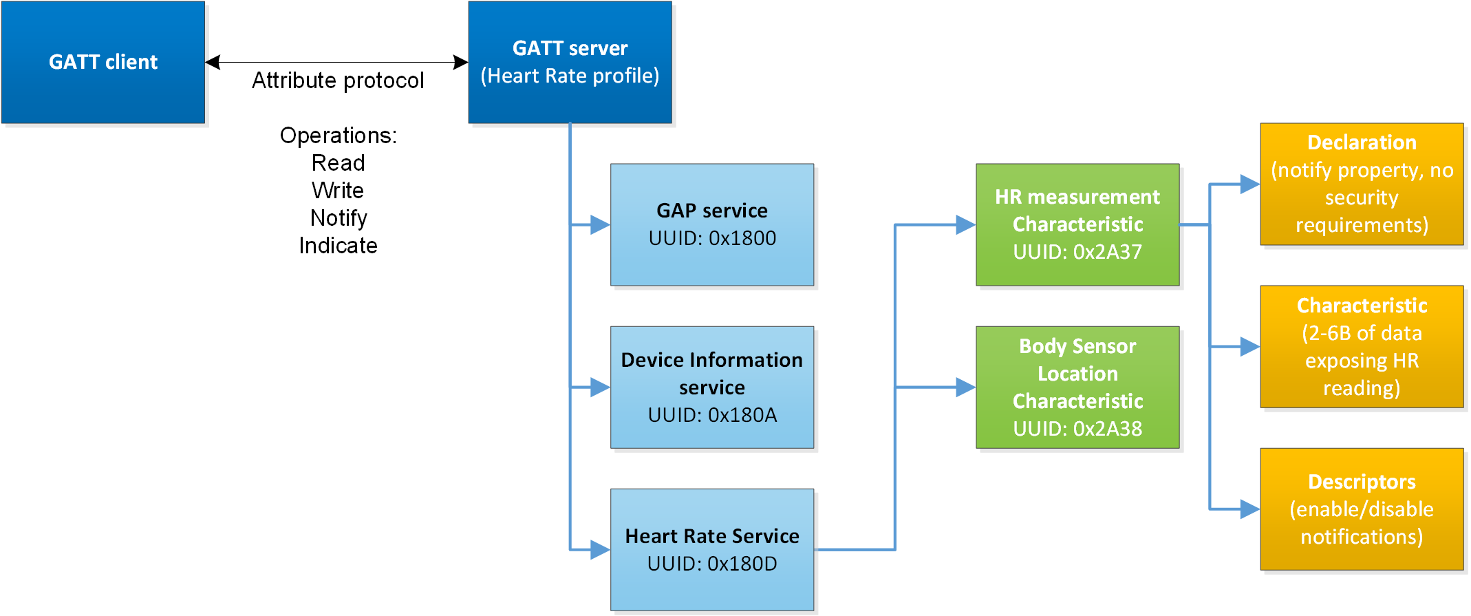 The figure below illustrates the relationship between GATT client, GATT server, services, characteristics and characteristics declaration, data, and descriptors.