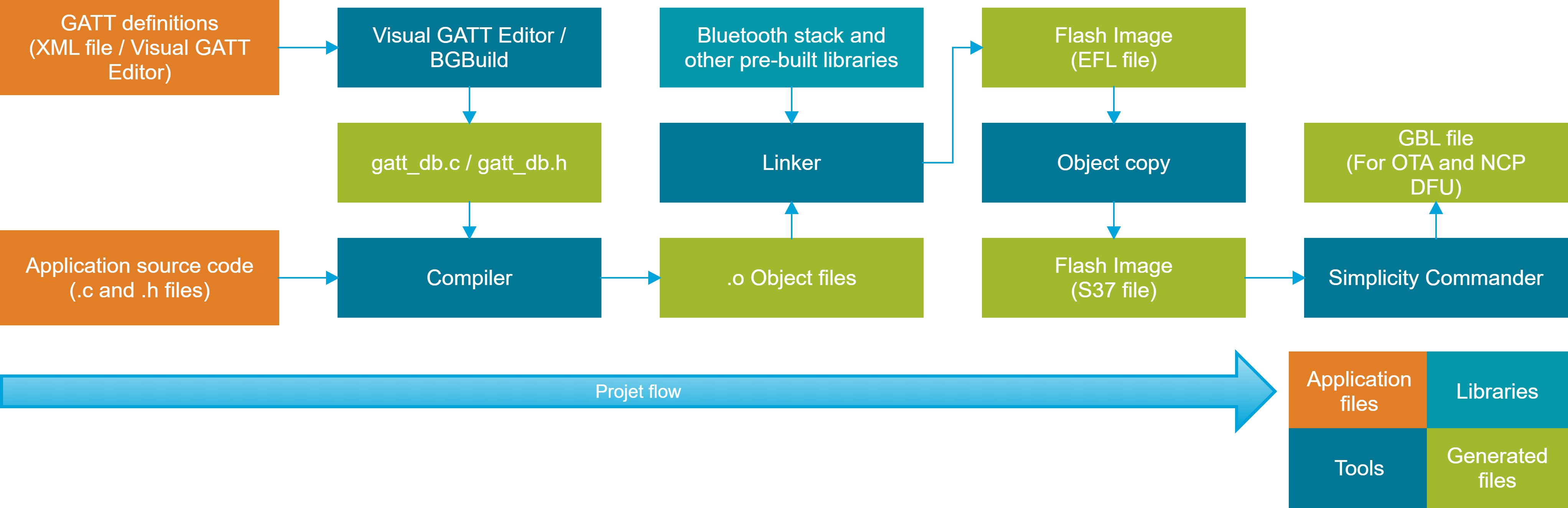 Compiling the project generates an object file, which is then linked with the pre-compiled libraries provided in the SDK. The output of the linking is a flash image that can be programmed to the supported Wireless Gecko devices.