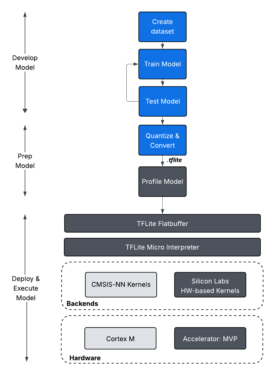 Silicon Labs currently supports TensorFlow Lite for Microcontrollers (TFLM) and associated software as an extension to SiSDK.