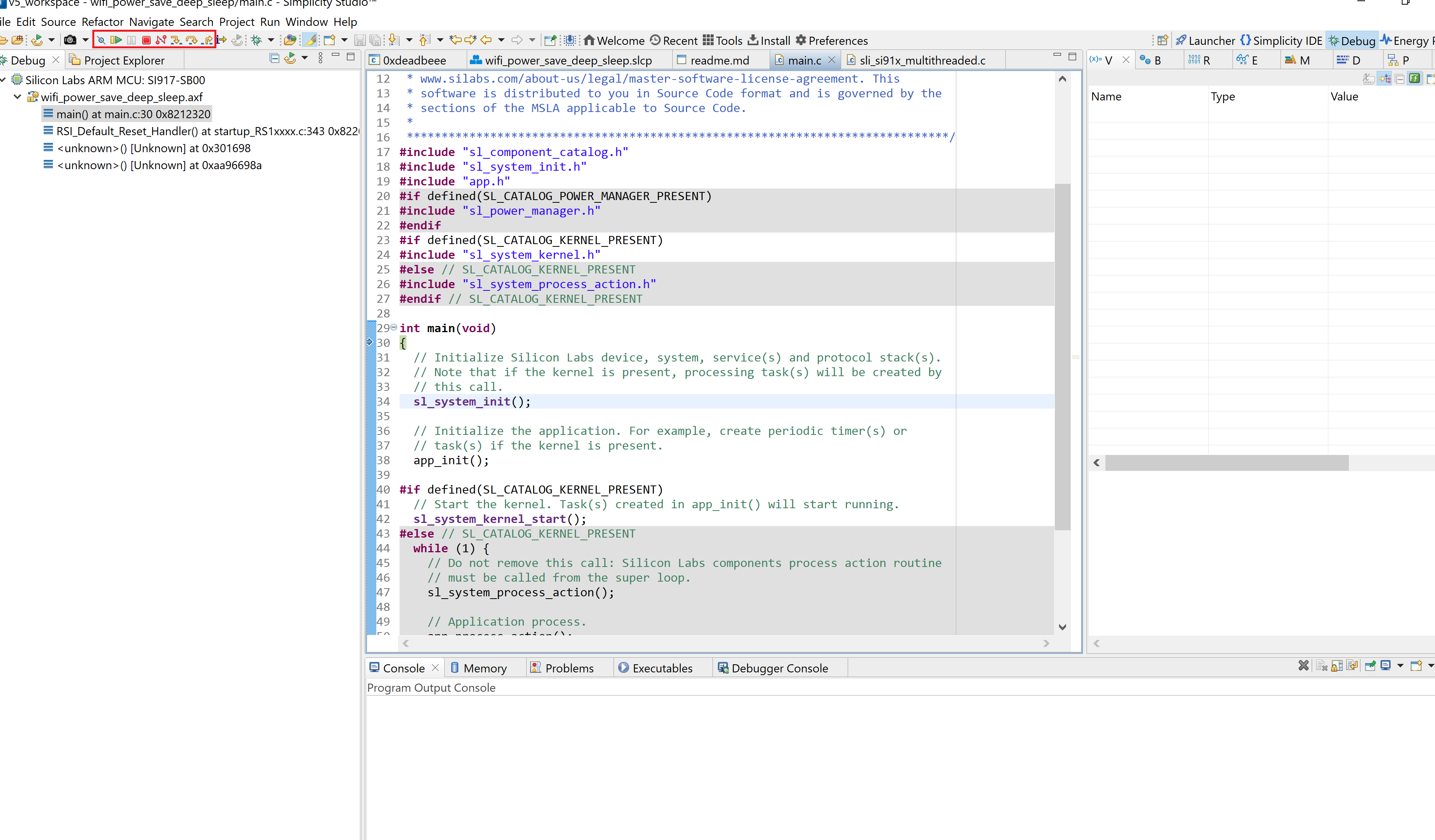 Simplicity Studio will switch to debug mode and halt execution at the main() function in your application.