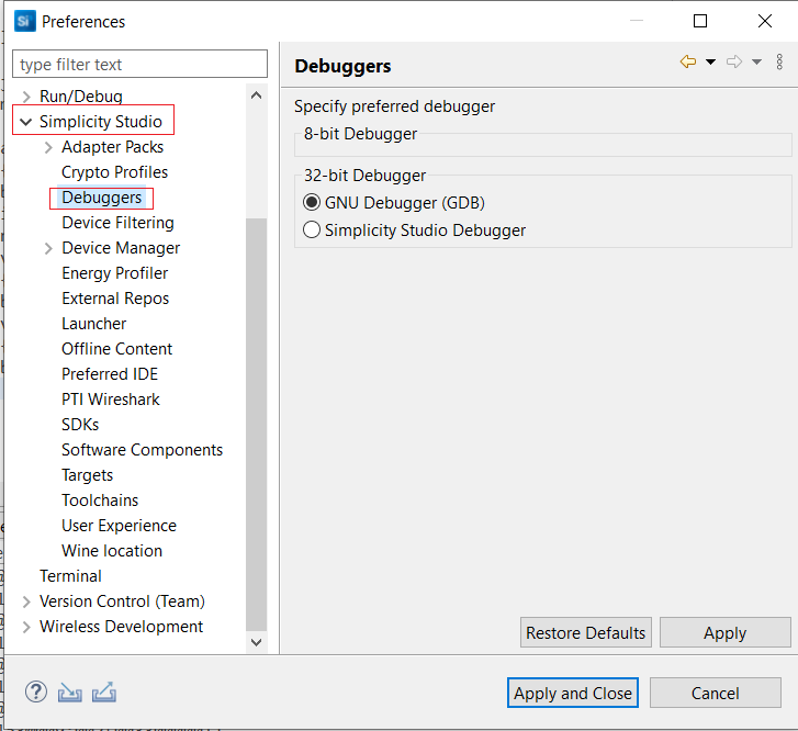 Expand the Simplicity Studio tab, and click Debuggers. Select GNU Debugger and click Apply and Close.