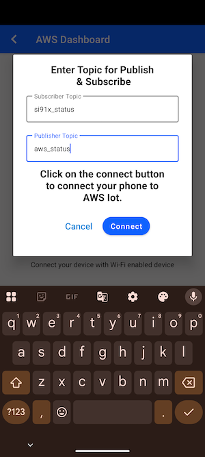 Once connected to the access point, you will be redirected to a new screen where you can enter the topic for publishing and subscribing, and then click Connect.