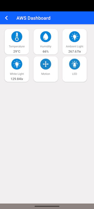 With a successful connection with AWS IoT, you can view the temperature, humidity, ambient light, and white light data on the AWS Dashboard screen.