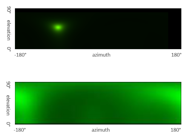 In an ideal case, MUSIC has excellent resolution in a good SNR environment and is very accurate. On the other hand, its performance is not very strong when the input signals are highly correlated, especially in an indoor environment. Multipath effects distort the pseudo-spectrum, causing it to have maximums at the wrong locations. The following figure compares the pseudospectrum under ideal circumstances (above) and in a real environment with a lot of reflections (below).