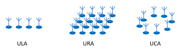 Antenna arrays for direction finding are usually divided into categories. The most common ones discussed here are Uniform Linear Array (ULA), Uniform Rectangular Array (URA), and Uniform Circular Array (UCA). The linear array is a one-dimensional array, meaning that all the antennas in the array lie on a single line, whereas the rectangular and circular arrays are two-dimensional (2D) arrays, meaning that the antennas are spread in two dimensions (on a plane).