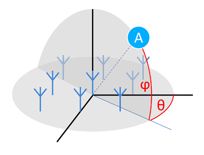 By using a one-dimensional antenna array, one can reliably measure only the azimuth angle, assuming the tracked device moves consistently on the same plane. Also, the azimuth measurement is limited to a 180 degree-wide angle range due to symmetry reasons. With two-dimensional arrays, one can reliably measure both azimuth (theta) and elevation (phi) angles in the 3D half-space, as shown in the following figure. If the array is extended to a full 3D array (antennas spread on all three Cartesian coordinates), then it is possible to measure the full 3D space.