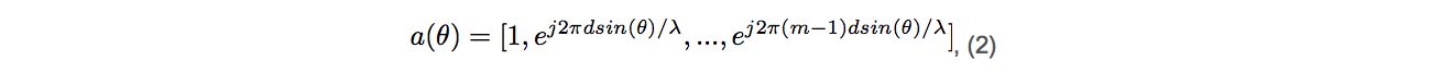 where 𝑑 is the distance between adjacent antennas; 𝜆 is the wavelength of the signal; 𝑚 is the number of elements in the antenna array, and 𝜃 stands for the angle of arrival. Steering vector (2) describes how signals on each antenna are phase shifted because of the varying distances to the transmitter. Using (1), an approximation of the so-called sample covariance matrix, 𝑅xx, can be calculated by: