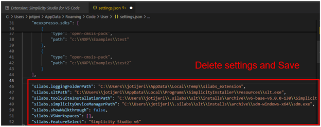 Optional: To ensure there are no leftover settings from a previous installation that could cause issues, you can clear the Silabs settings in the settings.json file by following the steps below.