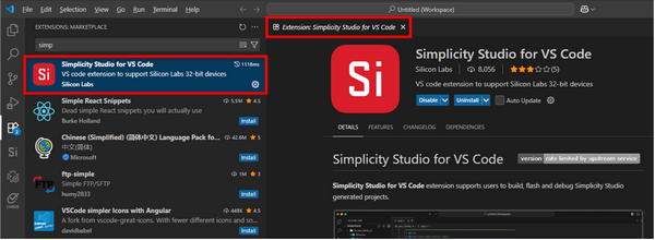 In the EXTENSIONS MARKETPLACE panel, click Simplicity Studio for VS Code extension. The extension displays in a tab on the right of your screen.
