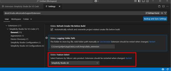Under Silabs: Feature Select, choose the version of Simplicity Studio you want to use from the drop-down list. In the example below, Simplicity Studio v6 is selected.