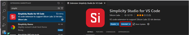 In the Extension search bar, type "Simplicity Studio" to locate the extension and click the Uninstall button.
