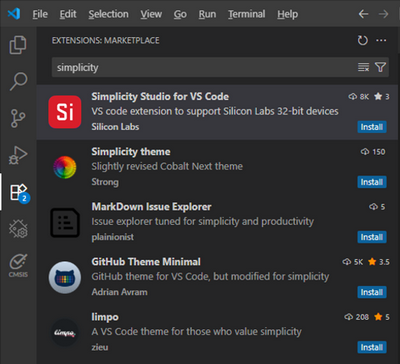 Install the Simplicity Studio VS Code Extension directly from the Extensions view in VS Code following the steps below:
