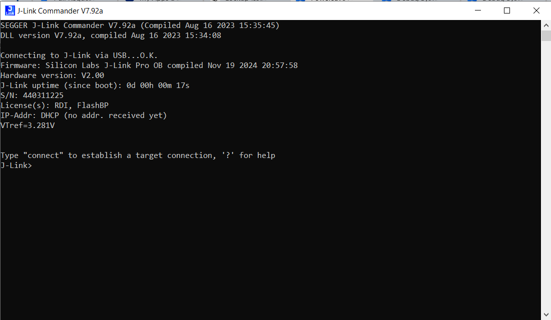 Connect your J-Link probe to the target microcontroller and to your PC via USB. Open J-Link Commander app and enter then we will see below prompt for connecting.