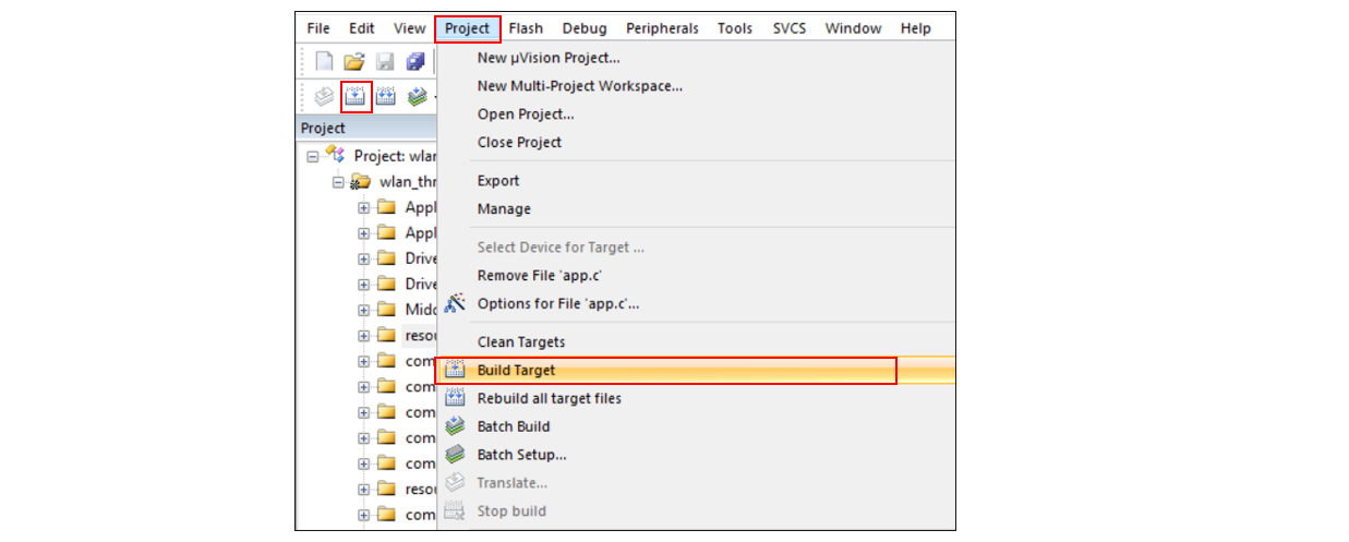 To build an application, select Project > Build Target from the menu or alternatively, click the Build button in the toolbar.