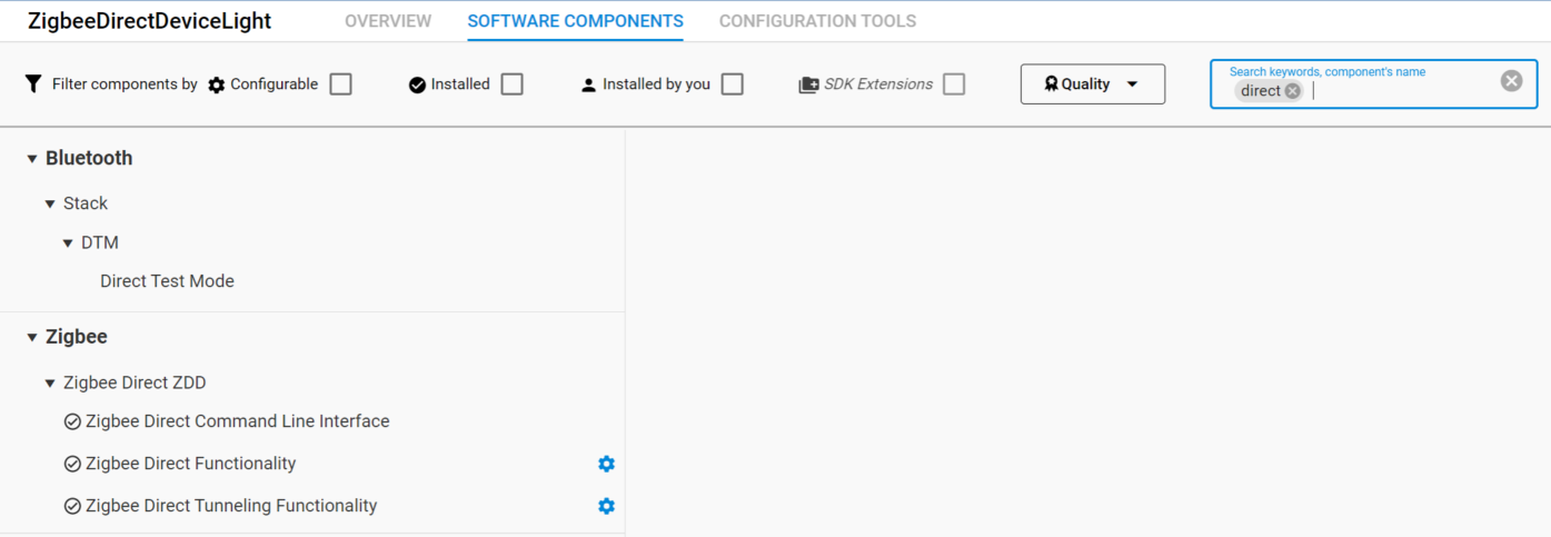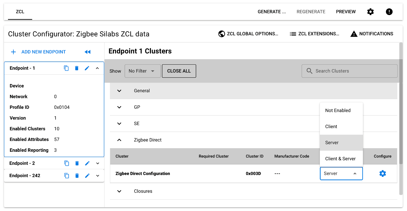 In the Cluster Configurator, also on the Configuration Tools tab, under Zigbee Direct, is the Zigbee Direct Configuration Cluster. It provides the interface for configuring Zigbee Direct.