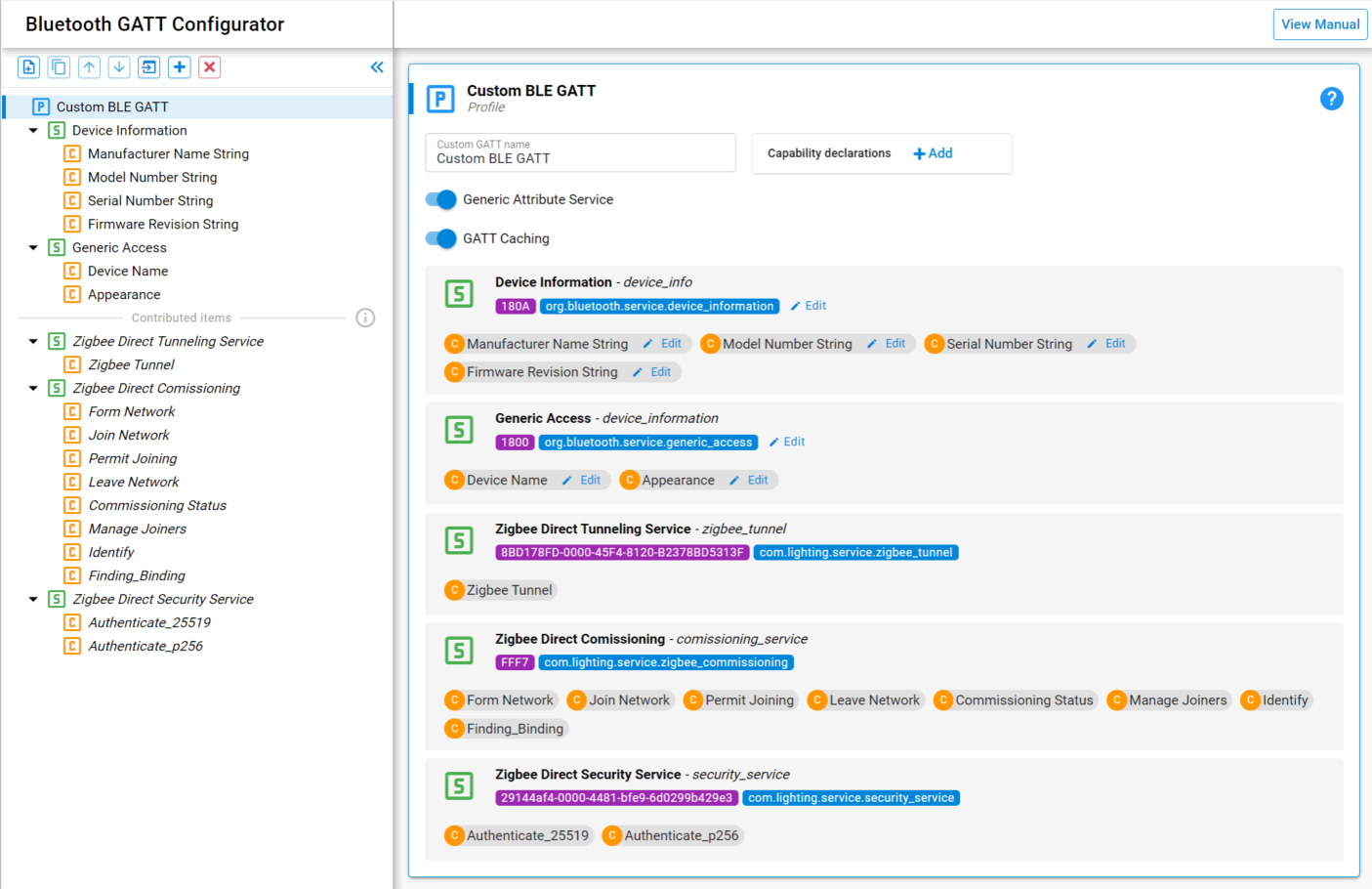 A Bluetooth GATT Configurator is available on the Configuration Tools tab. If you open it, you will see the BLE GATT services explained above: