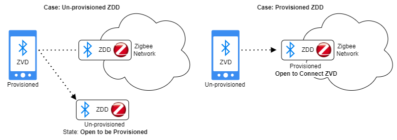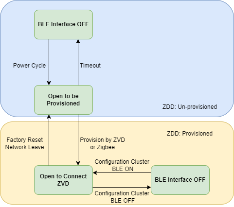 In the first scenario, where a ZDD is unprovisioned and its BLE interface is turned on, the ZDD is in the Open to be Provisioned state. In this state the ZDD sends out BLE advertisements in hopes a ZVD receives the advertisements and establishes a BLE link between the ZDD and the ZVD. The ZVD then starts a provisioning session with the ZDD that establishes a secure BLE connection. Once the provisioning session is complete the ZVD will have access to the Zigbee Direct Commissioning service and can configure the ZDD with all the required network information needed for the ZDD to successfully join the existing network. However, if a ZDD is in the Open to be Provisioned state and times out without a successful provisioning with a ZVD, the ZDD will close its BLE interface and transition to BLE Interface OFF state. The ZDD will need to be power-cycled or have a user interaction to re-open the BLE interface again to transition back to the Open to be Provisioned state.