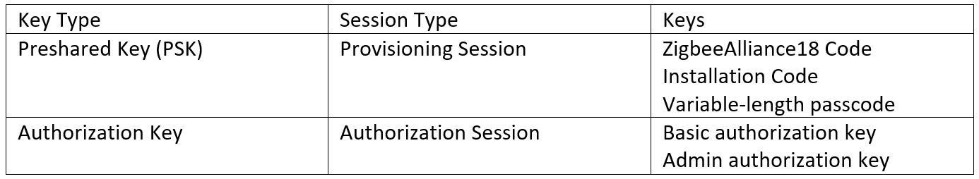 As mentioned in Zigbee Direct Provisioning, a ZVD and ZDD require a safe and secure BLE session to communicate with one another. When a ZVD and ZDD perform a secure session handshake it returns a session key that is used to establish a secure BLE session and an authorization level that grants the ZVD various levels of access to the ZDD. The levels of access include Admin and Basic authorization levels, both of which require an additional authorization session with an authorization key. If there is no explicit authorization session, the ZVD will have the lowest level of access that is granted to the ZVD with a successful provisioning session. The authorization level will remain consistent as long as the secure BLE session established between the ZDD and ZVD is active. The authorization level can only be upgraded or downgraded by establishing a new secure BLE session.