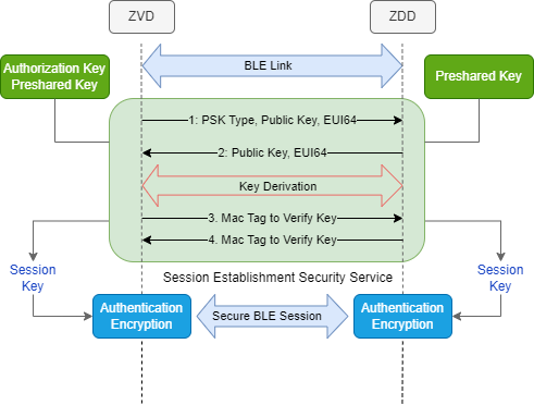 The ZVD creates a secure BLE session with the ZDD using one of the three pre-shared keys (Well Known Key, Install Code, or Variable Length Passcode).