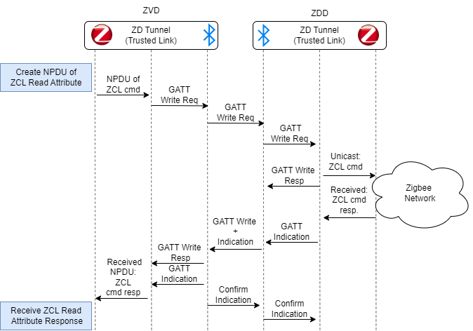 Essentially the ZVD creates a Zigbee command, transforms the Zigbee Command into a NPDU, and sends out a GATT Write Request to the ZDD.