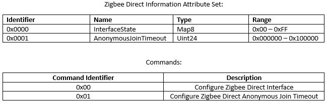 This cluster provides an interface for configuring Zigbee Direct functionality. All commands received by this cluster must be unicast messages only. The Cluster Id is 0x003D. This cluster contains the Attribute Set Identifier 0x000 Zigbee Direct Information. The Interface State refers to whether the BLE interface is enabled, while the Anonymous join timeout represents the provisioning session timeout. Below is more information on the attribute set and commands to configure them.
