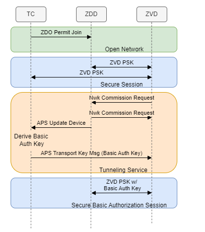 Once the secure session is established the ZVD uses the tunneling service to send Zigbee Commands to the ZDD to request to join the network and request basic authorization privileges.
